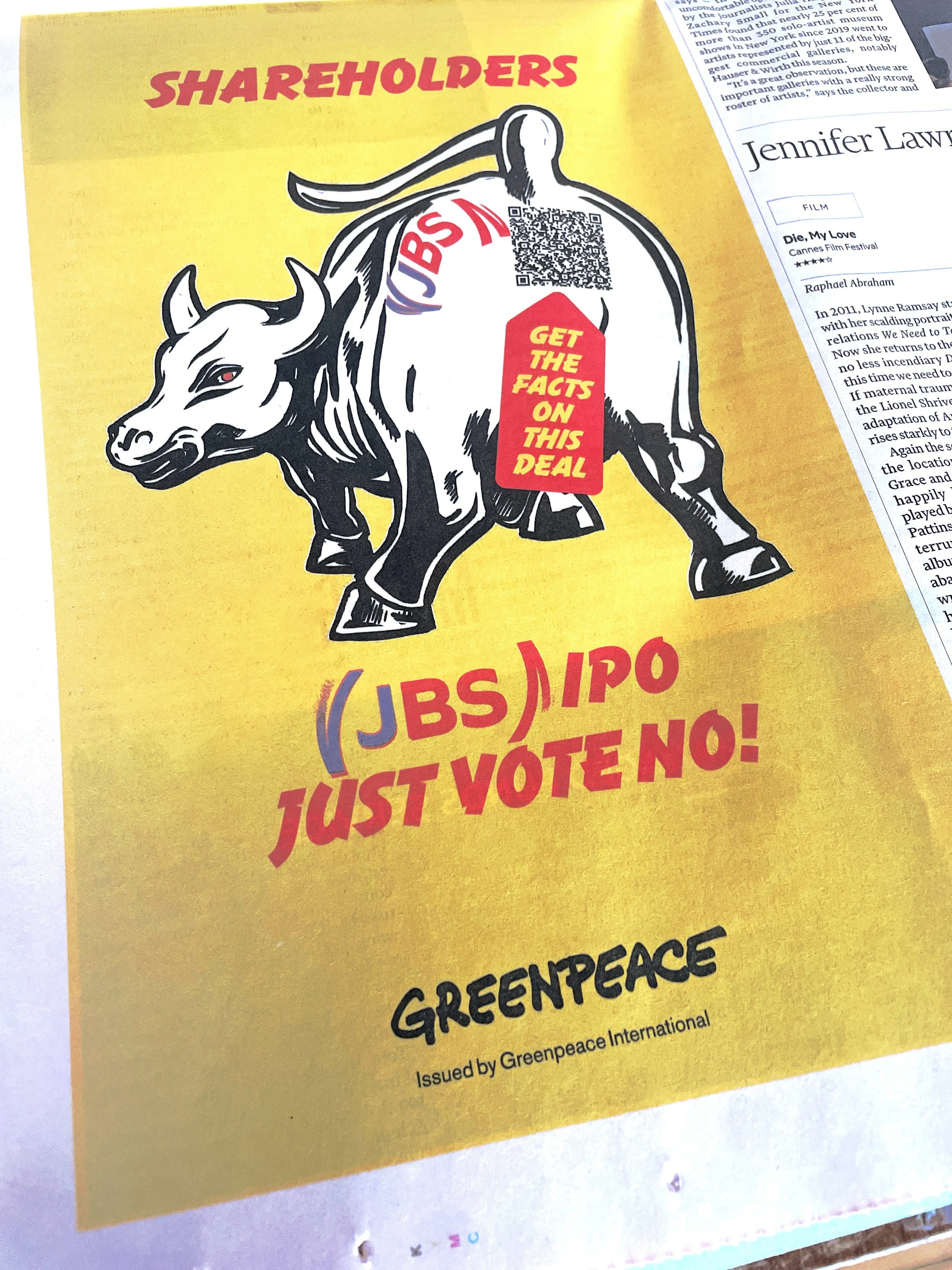 To read more about JBS’ BS scan the Wall Street bull’s QR code arseh*le in this challenging advert designed for Greenpeace which appeared in the Financial Times.