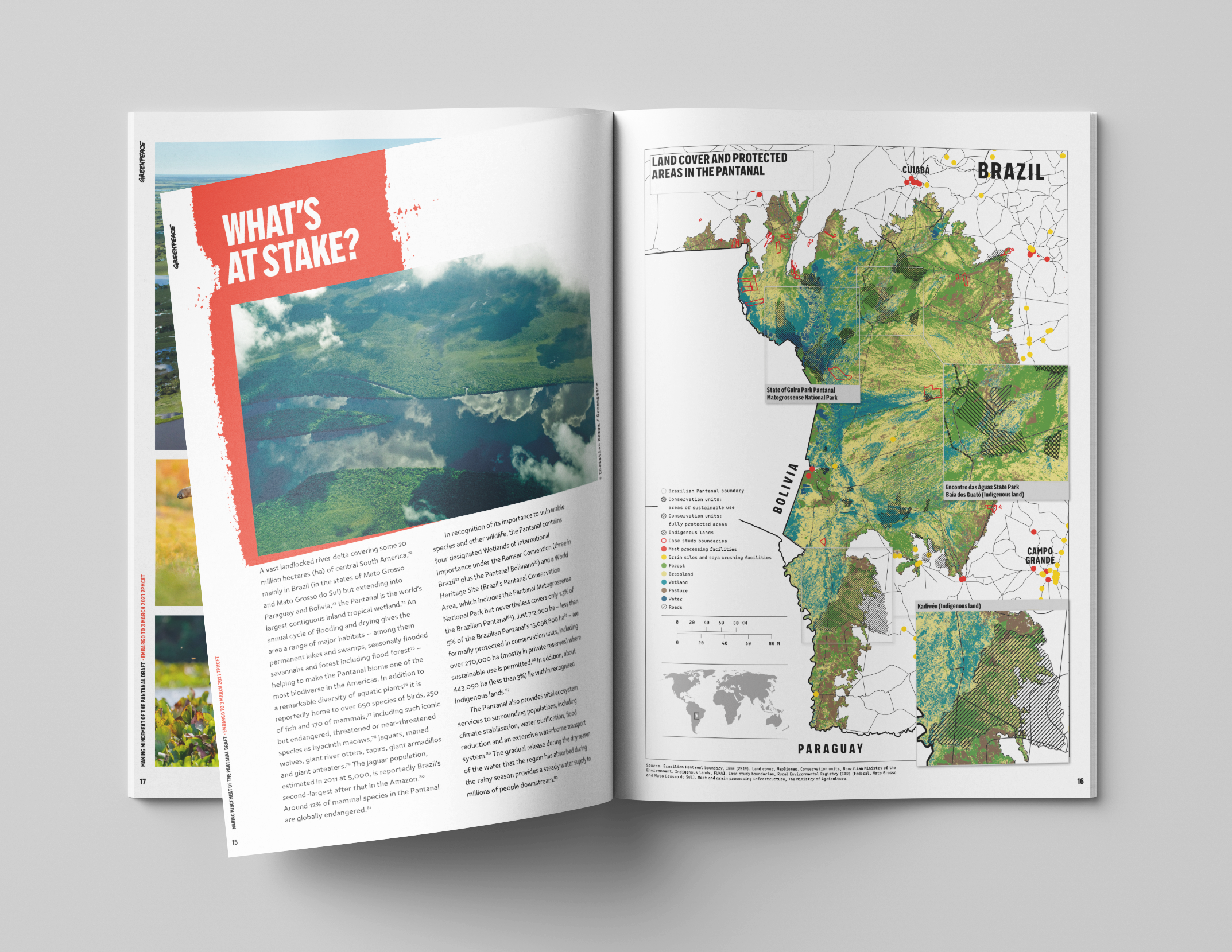The deforestation of the Brazilian Pantanal explained by way of geo-spatial mapping, supply-chain infographics and Greenpeace photography, all framed with dangerous/urgent looking bitmap graphics.